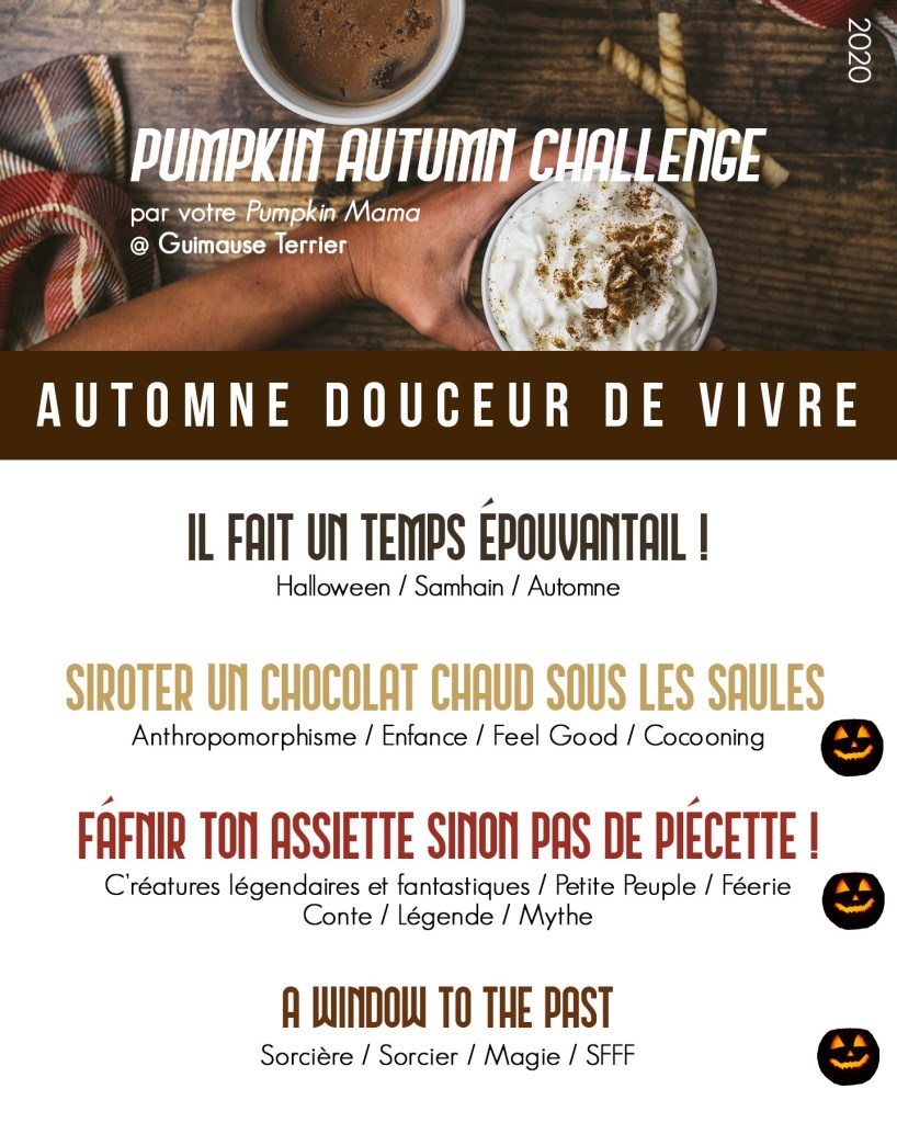 Je profite du #pumpkinautomnchallenge pour revoir le format de mes chroniques. Je ne sais pas si je le conserverai à l’avenir, mais sachez que chaque livre lu durant ce défi 2020 sera présenté de cette façon. J’ai voulu alléger ma charge de travail en les gardant « pour après » et en réduisant mes impressions à ce que je note dans mon carnet au fil de ma lecture (sauf si j’ai envie de parler plus en détail de l’auteur). J’espère que cela vous plaira quand même. N’hésitez pas à me dire si c’est le cas ou non, je suis toujours ouverte aux échanges.